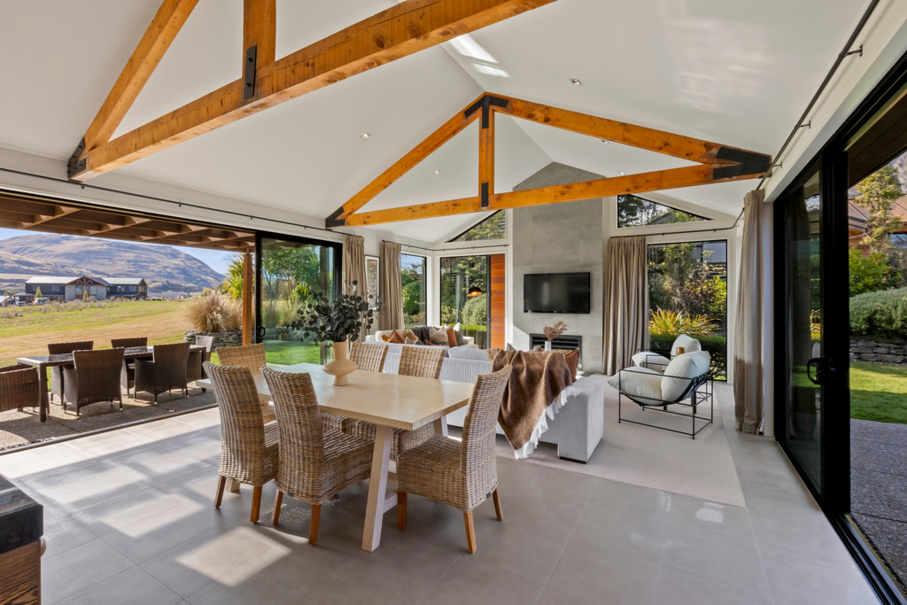 This architecturally designed, quality home offers the dream Jack's Point lifestyle. The 207.5 sq m (more or less) home has a sun-drenched Northwest orientation, a generous open Kitchen, Living and Dining area with vaulted ceilings and sits on a spacious 841 sq m (more or less) section with reserve frontage. The generous entranceway leads to a light filled kitchen and living wing with feature timber trusses, high windows, a gas fire with a built-in TV above it and wonderful indoor/outdoor flow to the sunny entertaining area, private garden and reserve beyond. The living wing is North-facing and opens out on both sides with stunning views of The Remarkables on the East side and views of the open reserve and mountains on the West side. The primary suite also has direct access to the Northwest garden with its mountain views and reserve frontage and features its own fully tiled en-suite. The other bedrooms are in the bedroom wing of the home and feature views of The Remarkables. The second bedroom has its own fully tiled en-suite and features direct access to its own timber deck and garden with stunning views of The Remarkables. The third bedroom and office share a third, fully tiled, family bathroom with a separate bath. The generous office could also be used as a fourth bedroom. This beautiful home also features a separate laundry and a 42 sq m (more or less) detached double garage. There are also several off-street carparks available in front of the garage. The home boasts gas hydronic underfloor heating with Nest Thermostat and a heat pump unit in the Kitchen, Dining, Living area in addition to the living room gas fire, promising warm and cosy winter nights! Additionally, there are heat pump units in the primary bedroom and second bedroom. There is a full furniture package available. The garden features stunning schist walls around its boundary, schist pavers, a timber deck, an entertaining patio, flat lawn, extensive mature landscaping and flows on to a large, sunny reserve. There are expansive mountain views from all around this cedar-clad home. This is truly a beautiful home, inside and out!...