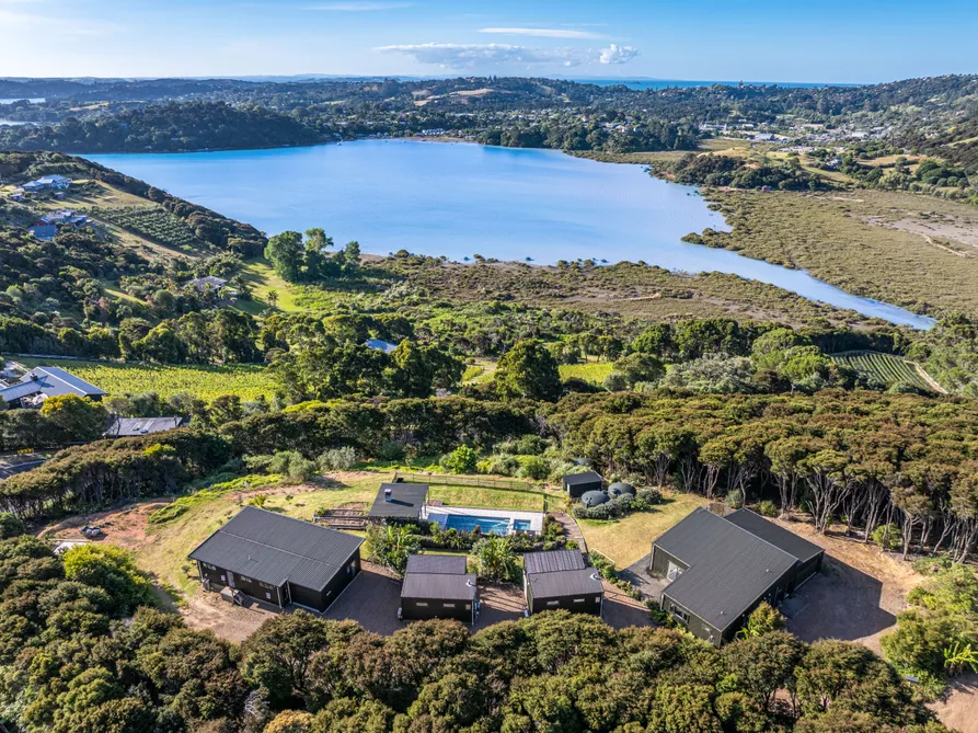 The pared back clean simplicity is a result of the thoughtful development of this wrap-around hillside site that keeps revealing the most exquisite of outlooks. Lazy island summers that shift with ease from beaches and vineyards to poolside to warm spa and fireside conversations only interrupted by sunset awe. Warmth, welcome and sharing are tangible here. The Onetangi valley of renowned vineyards, Coromandel Peninsula, the immediacy of Anzac Bay and the awe of Putiki O Kahu directly opposite, the cone of iconic Rangitoto and silhouette of Auckland's CBD. You'll be mesmerized by these vistas where ancient history and the present merge. Back on terra firma the property offers two homes; a contemporary four bedroom plus study and a nicely curated two bedroom, both with garaging . Sited privately between these are two visitor studios. Generous parking to the door of each dwelling ensures easy accessibility. All dwellings face North West as do the pool and pavilion, the days here are long year round. Extended family have co-invested and it's worked perfectly but secondary school off island commences shortly and life is transporting this family rapidly city side. Income stream figures are available on request. A glamping site and tiny home both sit nestled into their private positions, the tiny house is available and offered separately. There are so many options of use here that you have the security of knowing the property can flex to meet your needs as life changes. Keep tapping the enduring potential and you'll continue to be rewarded, one of the most satisfying will be sharing with family, friends and or paying guests. The owners are braced to meet the market. eBook with property details and chattels available on request....